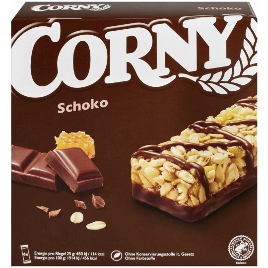 Unsere CORNY Classic Riegel machen ihrem Namen alle E(Ä)hre und gehören zu den beliebtesten Müsliriegeln überhaupt. Wie zum Beispiel der CORNY Schoko mit wertvollen Hafer-, Weizen- und Gerstenflocken, kernigen Erdnüssen und mit hochwertigem Bienenhonig verfeinert.